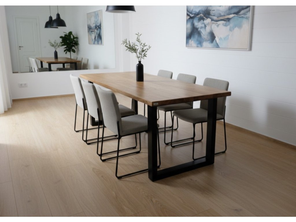 Stůl Palermo je poctivý kus nábytku, který v sobě spojuje čistý moderní design a funkčnost pro každodenní používání i významné jednání či setkání. Masivní dubová deska o tloušťce 40 mm přináší do prostoru přirozenou krásu dřeva s unikátní kresbou, zatímco stabilní ocelová podnož dodává konstrukci pevnost a nadčasový charakter.