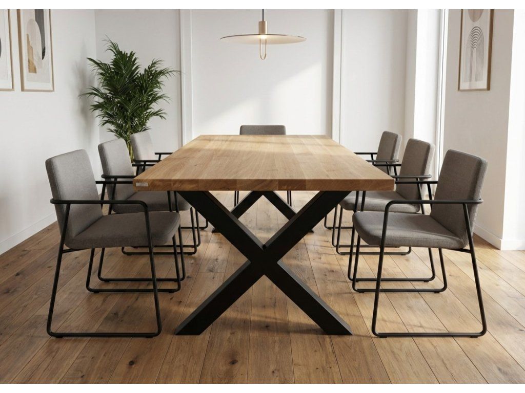 Špičák je výrazný jednací stůl navržený pro moderní kanceláře, zasedací místnosti i reprezentativní prostory. Spojuje sílu masivního dřeva s dominantní ocelovou podnoží ve tvaru X, která mu dodává nezaměnitelný charakter a maximální stabilitu.