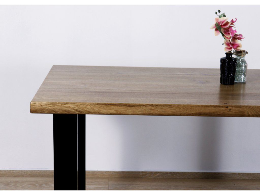 Masivní stolová deska vyniká přirozenou kresbou dřeva a precizním zpracováním různých hran. Každý kus je originál díky jedinečné struktuře masivu.