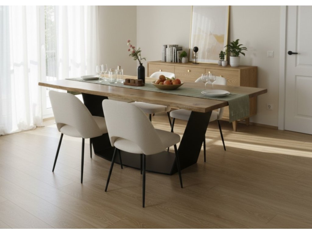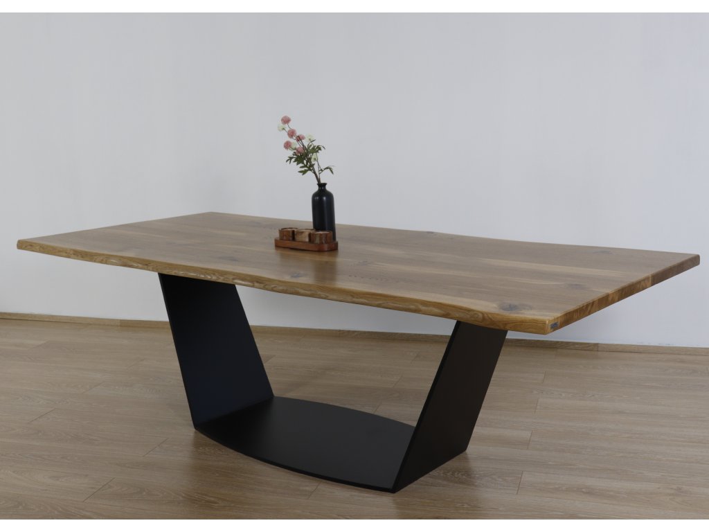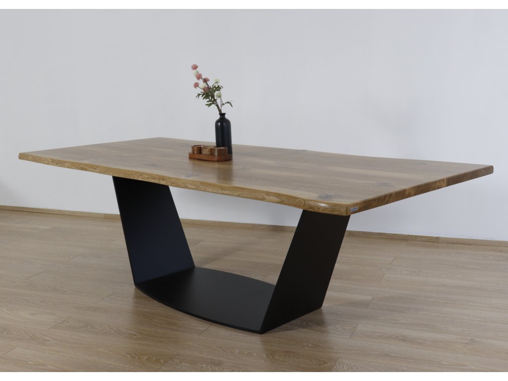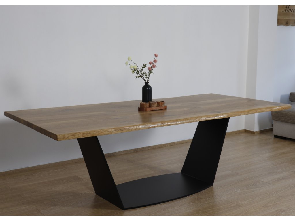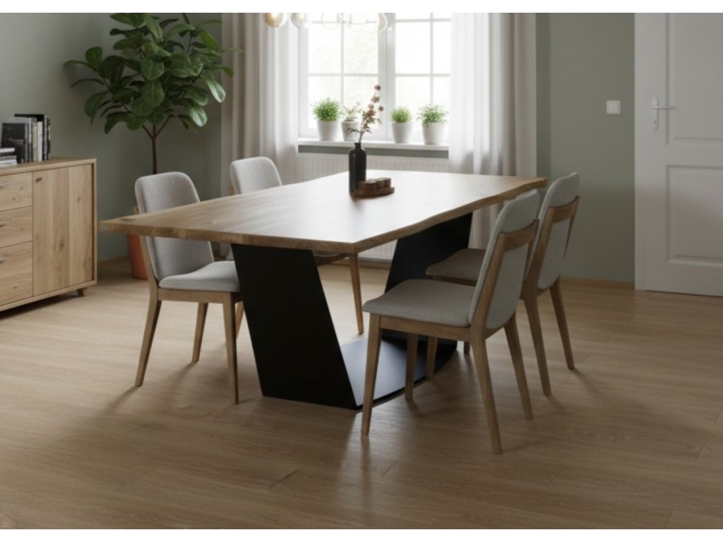 Váš interiér si zaslouží stůl, který zaujme na první pohled a zároveň odolá zkoušce času. Tento moderní jídelní stůl je vyroben z kvalitního dubového masivu, který dodává každému kusu jedinečný charakter díky přirozené kresbě dřeva. Robustní podnož z ocelových ploten o tloušťce 15 mm pak zajišťuje maximální stabilitu a dodává stolu elegantní industriální vzhled.