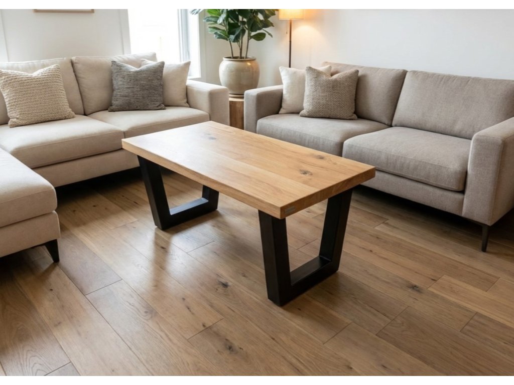 Konferenční stolek Melbourne je jednoduchý ale stylový konferenční stolek, který zdobí masivní dubová spárovka s tloušťkou 40mm. Je vyroben z kvalitních materiálů a jeho jednoduchý design zahrnuje výraznou podnož ve tvaru “V” z masivního jeklu tl. 80mm.