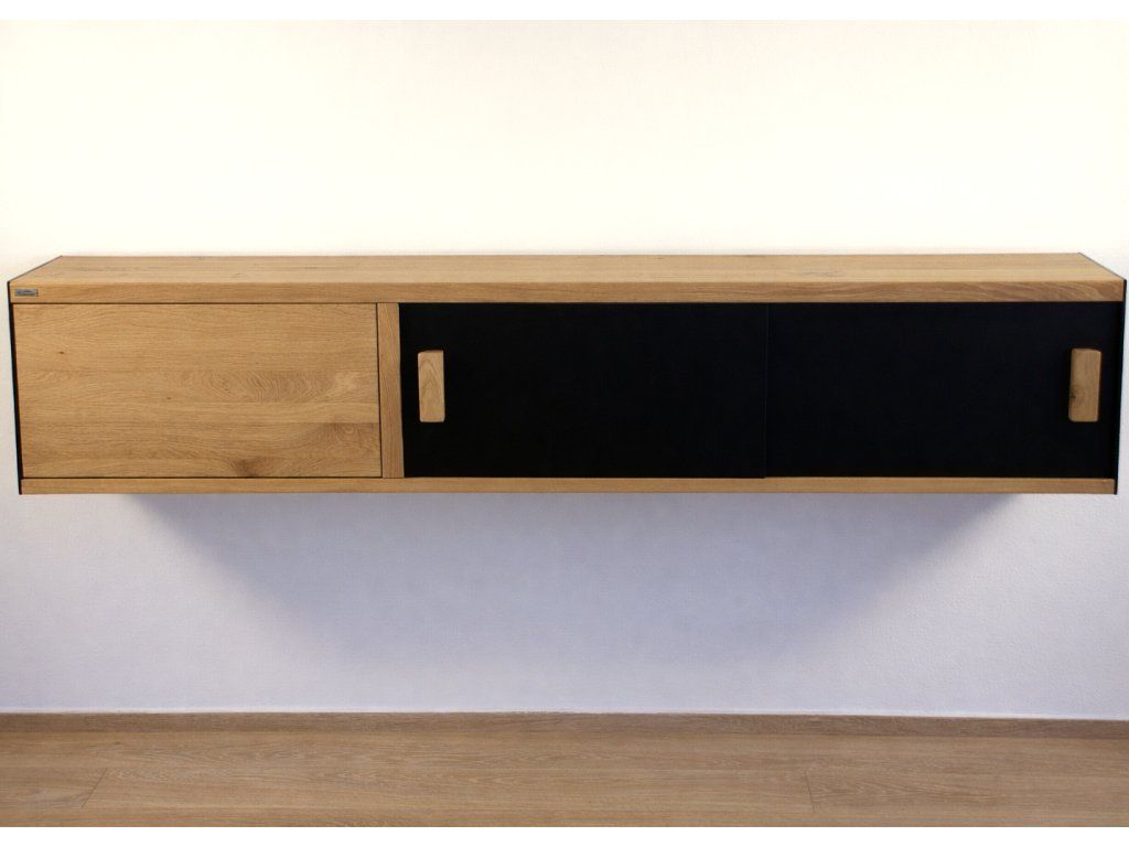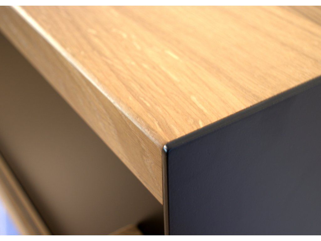 Dominantním prvkem jsou dvoje posuvné dveře z ocelového plechu o tloušťce 3 mm, které působí robustně a zároveň elegantně. Díky posuvnému systému si můžete snadno regulovat, která část úložného prostoru zůstane otevřená a která skrytá.